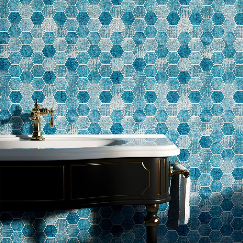 This patterned textile-look blue hexagon tile has an utterly unique design that takes this vintage bathroom to the next level. It adds a distressed, artistic look to bathrooms.