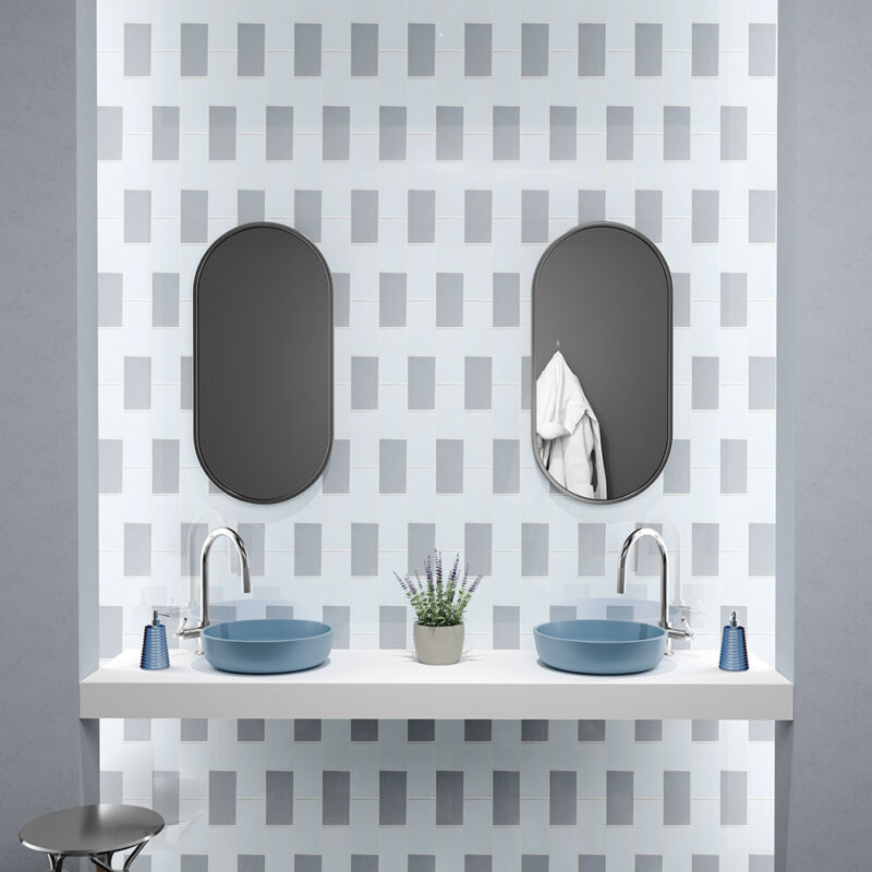 For something a little lighter, consider these light, powder-blue subway tiles made of glass and ceramic. They look beautiful in minimalist bathrooms that have a lot of white tones.