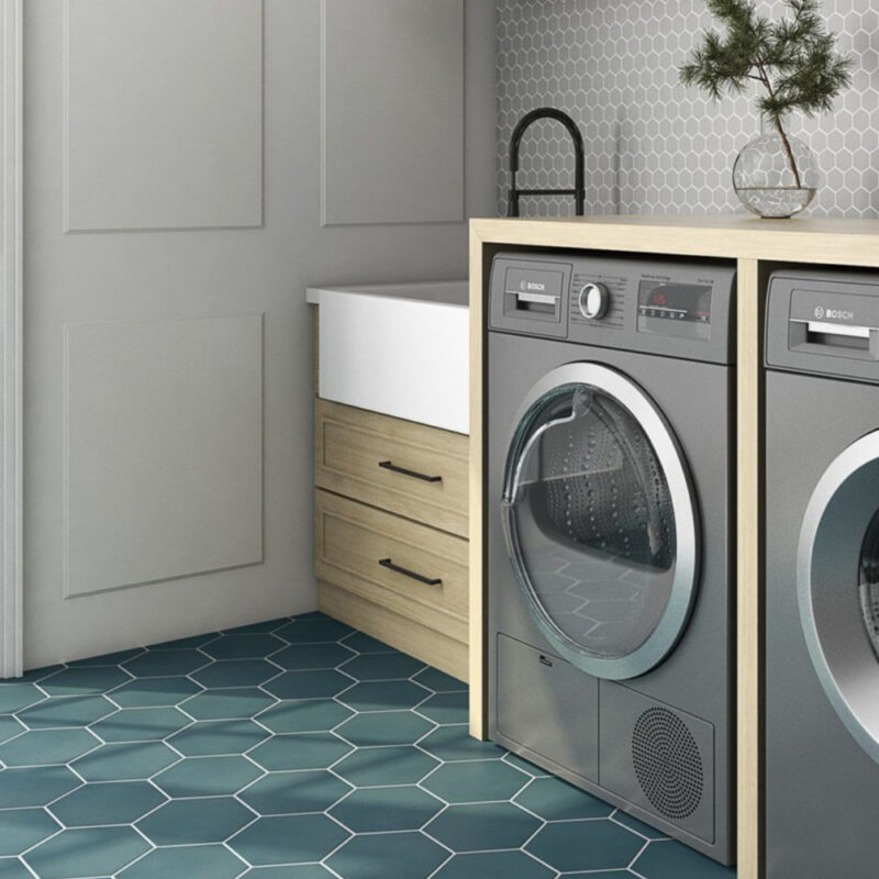 For a blue color floor tile idea, consider this dark turquoise blue hexagon tile. It adds a splash of color to this bathroom/laundry room combination and makes the room feel more lively—this tone of blue complements both cool gray tones and warm wood tones.