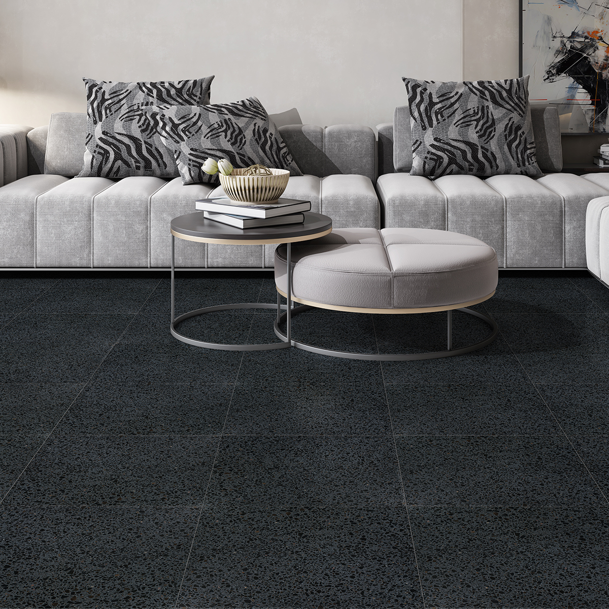 Black Tiles 15 3/4x15 3/4 Terrazzo TilesMake your bathroom, kitchen or any other place look perfect with Black Honed Terrazzo Tile. Honed finish provides less reflection on your space and offers a more silky view. Experience the elegance of Black Terrazzo tile in your space.