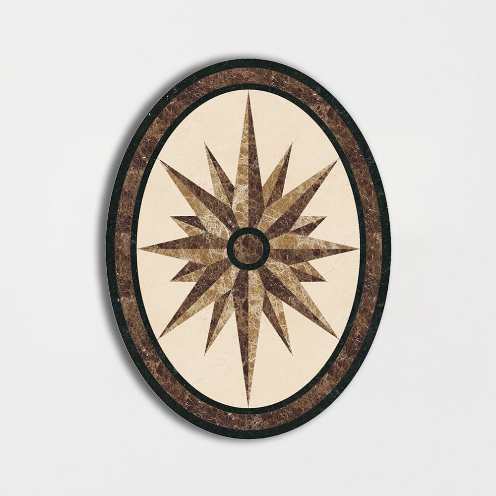 Oval Aluminum Backed Multi Finish North Star Marble Medallions on Stone Tile Depot with incredible discounts. Product size is 3x4x3/8. 30 Day Money Back Guarantee for 100% customer satisfaction. All our Medallions are in stock and ready to ship.